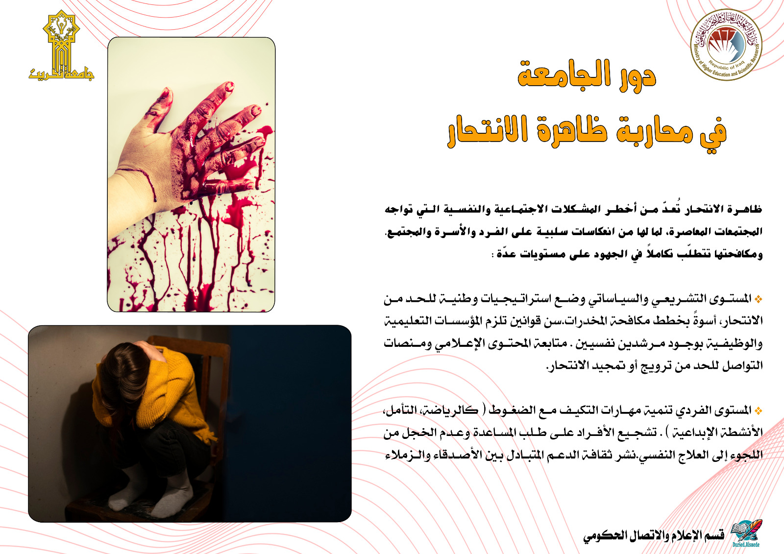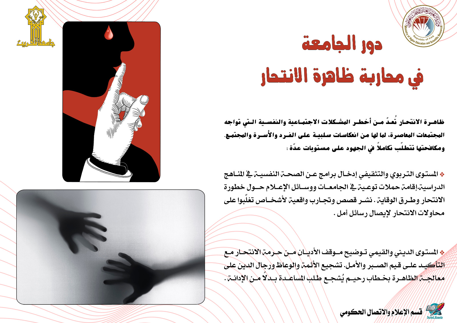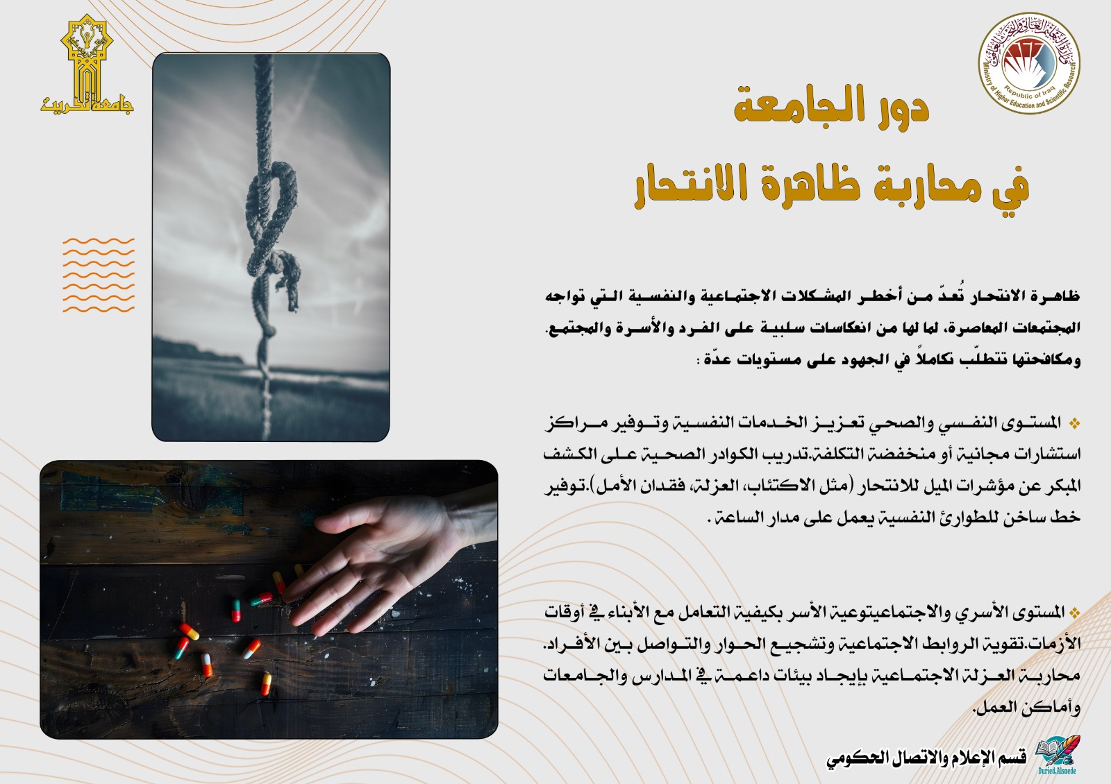 في إطار سعيها لتعزيز الوعي الصحي والنفسي بين الطلبة والمجتمع، أطلقت جامعة تكريت حملة توعوية تضمنت نشر بروشورات إرشادية حول مظاهر الانتحار وأسبابه وطرق الحد منه.