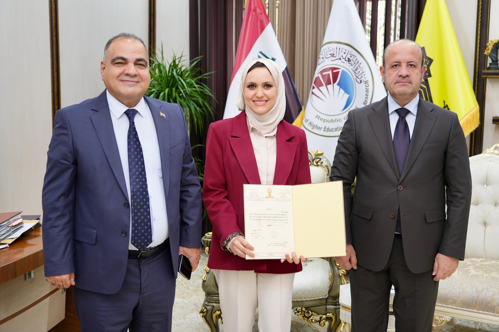 وجاء هذا التكريم تقديراً لأداء الطالبة المتميز وتمكّنها من عرض أطروحتها العلمية بإيجاز واحترافية عالية، بعد أن اجتازت بنجاح خمس مراحل من التصفيات، بدأت من مستوى القسم ثم الكلية فالجامعة فتصفيات الوزارة، وصولًا إلى المرحلة النهائية التي أحرزت فيها المركز الأول بمعدل 96.2% متفوقةً على نخبة من طلبة الدراسات العليا من مختلف الجامعات العراقية.
