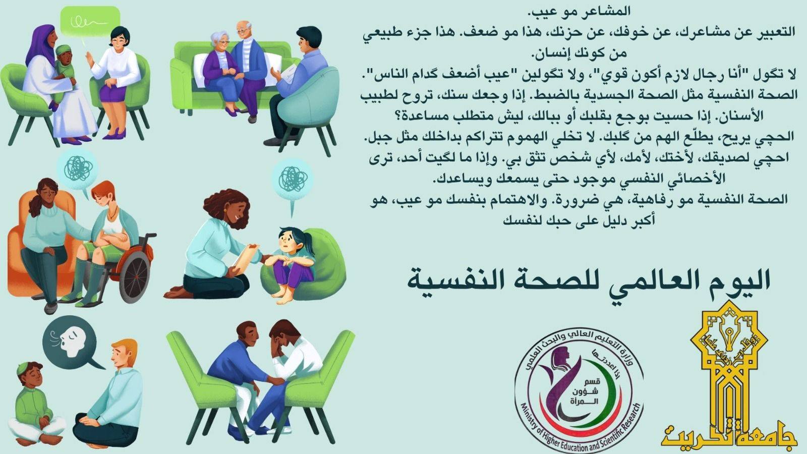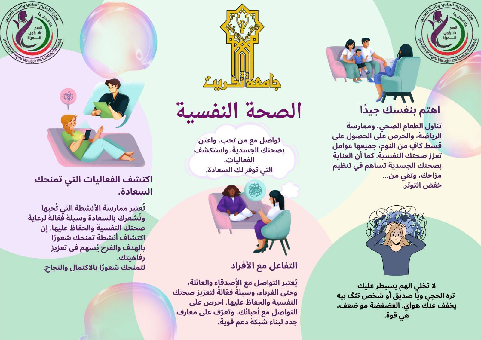 في إطار الاحتفال باليوم العالمي للصحة النفسية، قامت شعبة شؤون المرأة في جامعة التكريت بمبادرة تطوعية مميزة، حيث تم تصميم مجموعة من البروشورات التوعوية التي تهدف إلى نشر المعرفة وتعزيز الرفاهية النفسية في مجتمع الجامعة.