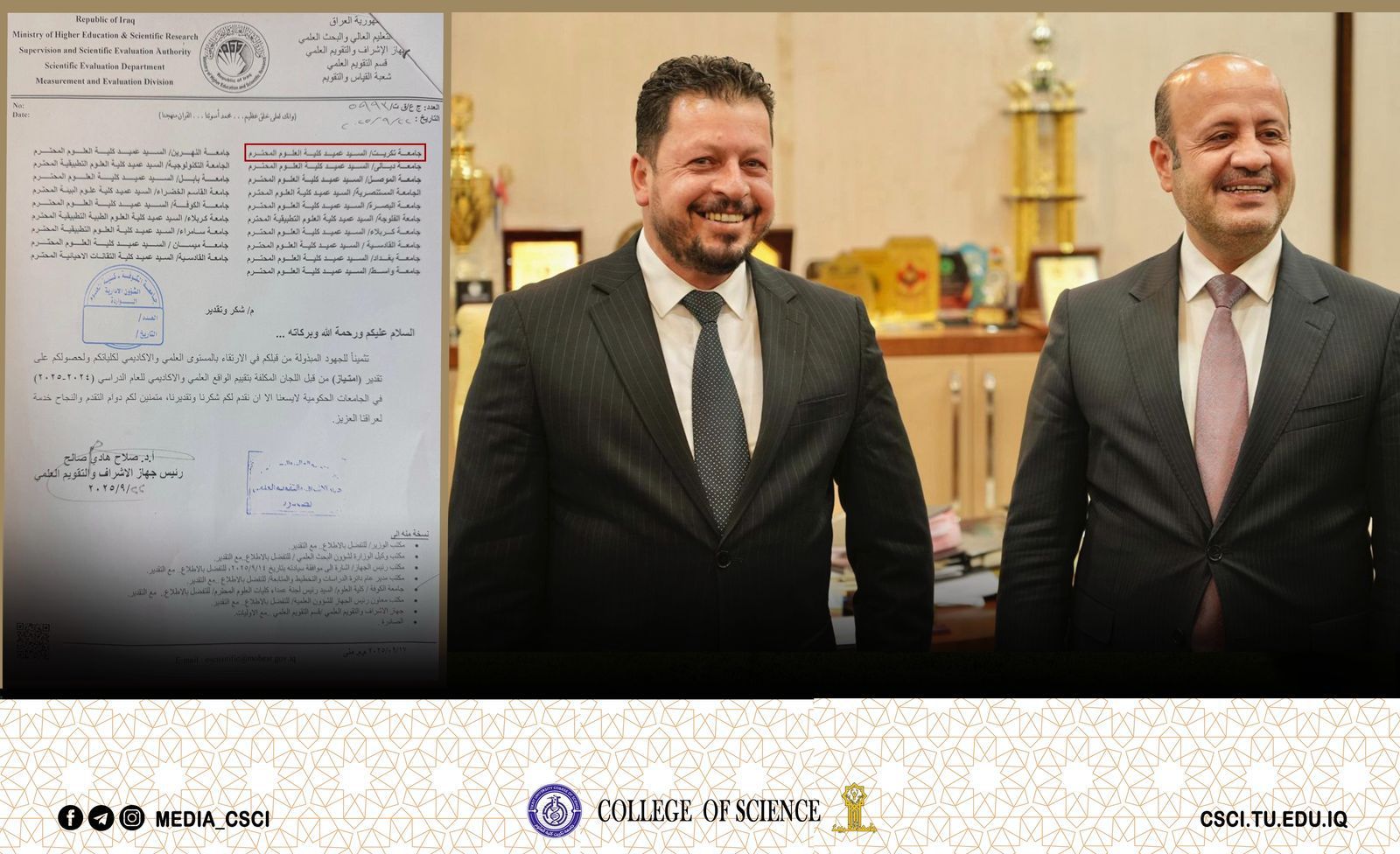 وفي ثناء على هذه الجهود، تسلم الأستاذ الدكتور عبد الخالق علوان محيميد، عميد الكلية، كتاب شكر وتقدير من وزارة التعليم العالي والبحث العلمي – جهاز الإشراف والتقويم العلمي، عرفاناً بالإنجاز الكبير الذي حققته الكلية.