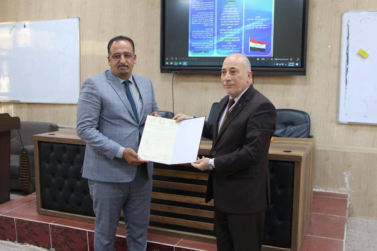 وفي ختام الندوة تم تقديم شهادة تقديرية للأستاذ الدكتور محمد صبحي خلف تثميناً لمشاركته العلمية القيمة .