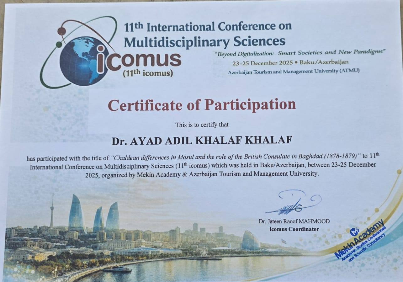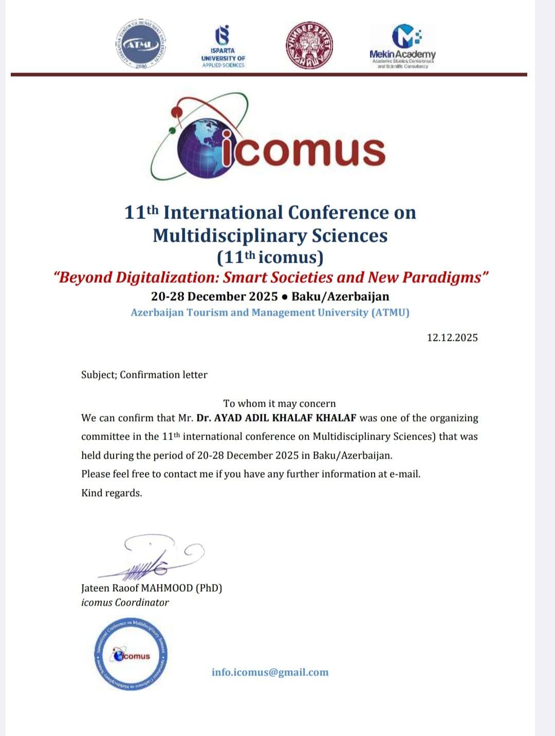 في إطار سعي جامعة تكريت المستمر لتعزيز حضورها الأكاديمي على الصعيد الدولي والانفتاح العلمي على الجامعات والمؤسسات البحثية العالمية، شارك الدكتور إياد عادل خلف، مدير شعبة المطبعة في جامعة تكريت، في المؤتمر العلمي الدولي الحادي عشر للعلوم المتعددة، وذلك بناءً على الدعوة الرسمية الموجهة إليه من جامعة أذربيجان للسياحة والإدارة (ATMU).